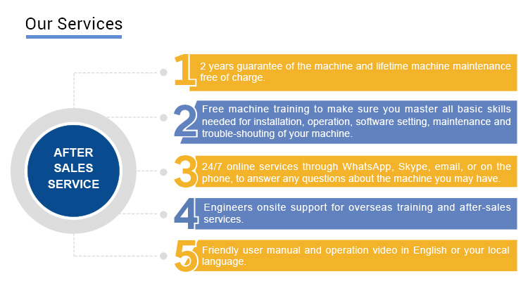 答:如果機器出現問題,我們將在機器保修期內免費提供零件。同時我們還提供終身免費售後服務。因此,如有任何疑問,請告訴我們,我們將為您提供解決方案。